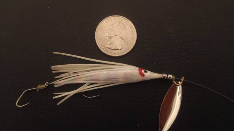 All Kokanee and trout candy squid pictured come as pictured below, a complete 30" leader, two #4 sickle hooks, glow and UV squid of your choice, bearing, spinner blade, and 25 lb test line. AND YES these also work great on salmon of all species sockeye Chinook coho Chum Atlantic and pink.